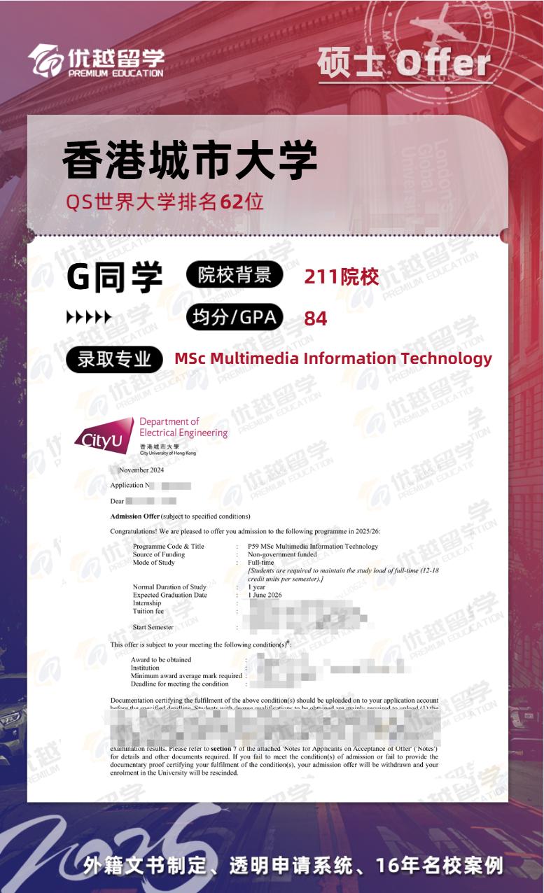 當(dāng)前位置: 首頁(yè) > 關(guān)于優(yōu)越 > 錄取榜單 > 25fall香港碩士留學(xué)中介offer+1:【香港城市大學(xué)】多媒體信息技術(shù)專(zhuān)業(yè)