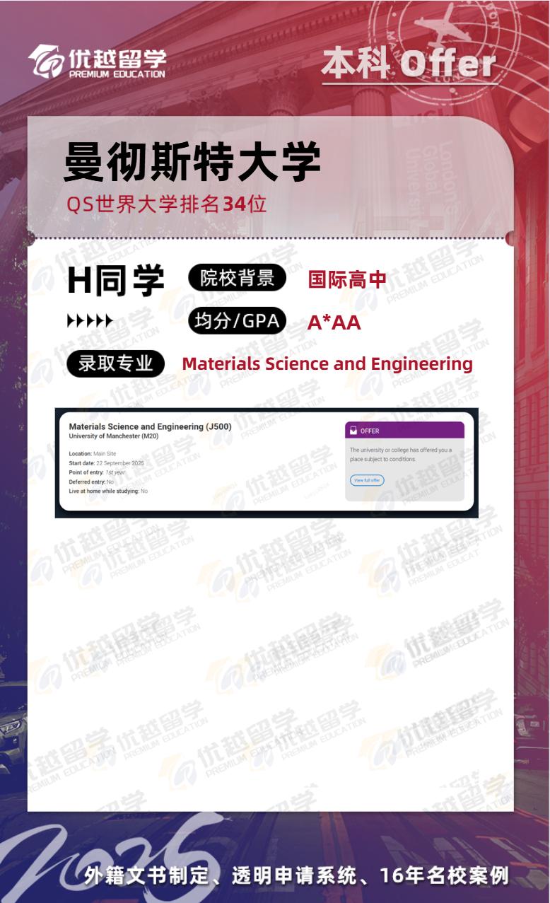 恭喜優越學員英國本科申請首戰告捷,順利斬獲曼徹斯特大學材料科學與工程專業offer。接下來,就跟優越君一起看看,H同學的上岸歷程~