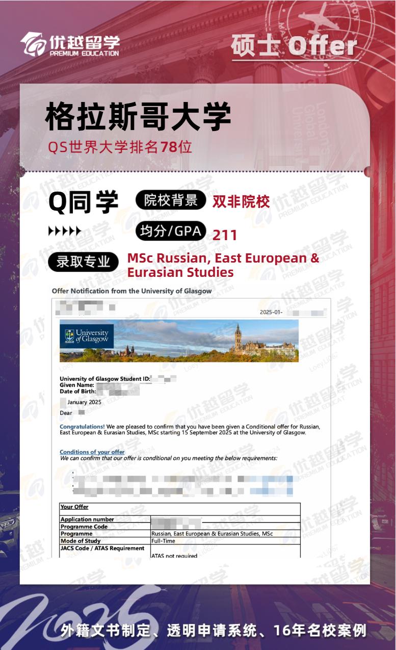 以上是【25fall英國留學機構碩士offer:【格拉斯哥大學】俄羅斯、東歐和歐亞研究專業】相關的全部內容,查看更多【offer榜單】、【名校案例】相關資訊可前往【優越留學】首頁!世界名校申請,找優越留學!選校定校、申請規劃、文書寫作、背景提升、方案定制一套搞定!點擊【在線咨詢】,優越留學顧問24h在線為您一對一解答!