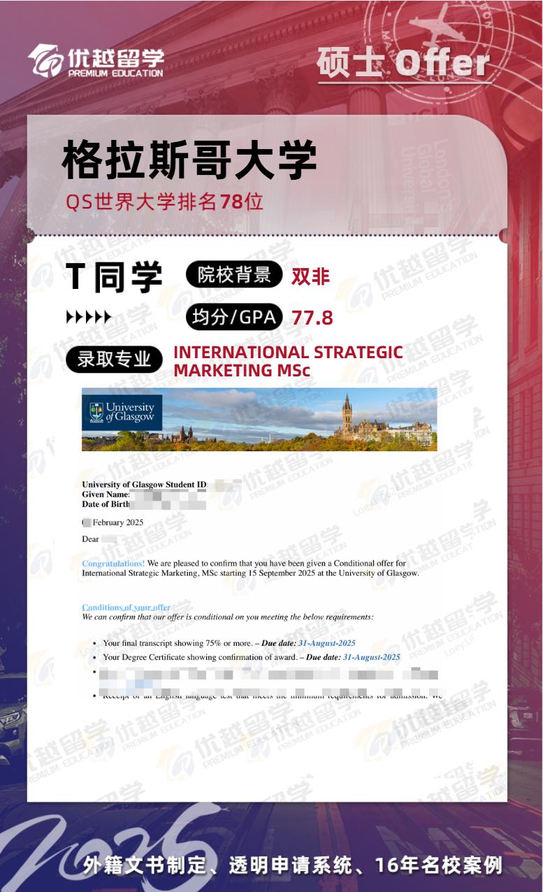 恭喜英國留學機構優越學員25fall傳來捷報,拿下格拉斯哥大學全球經濟碩士offer。接下來,就跟優越君一起看看這位同學的上岸歷程~