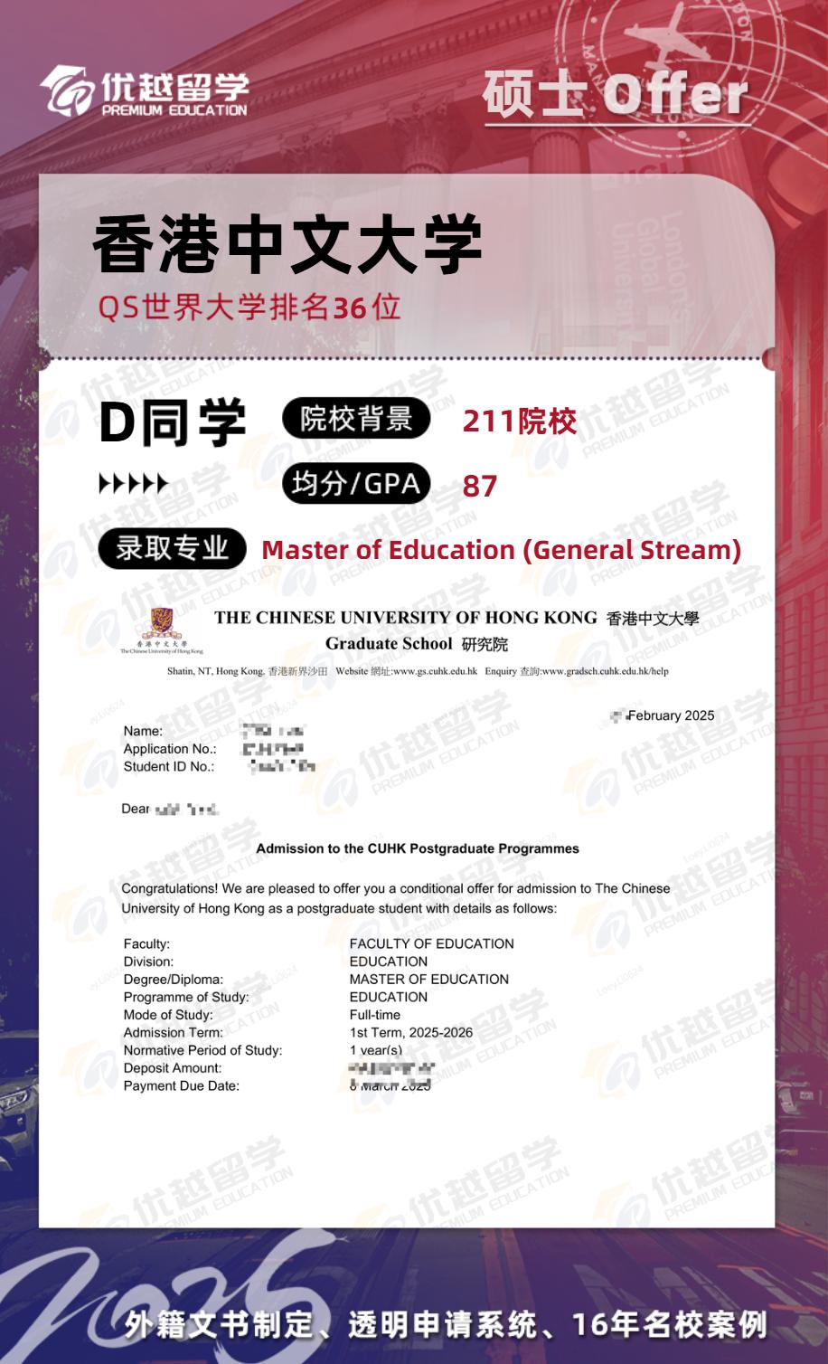 以上是【25fall香港碩士留學offer上新!211錄取【香港中文大學】教育專業】相關的全部內容,查看更多【offer榜單】、【名校案例】相關資訊可前往【優越留學】首頁!世界名校申請,找優越留學!選校定校、申請規劃、文書寫作、背景提升、方案定制一套搞定!點擊【在線咨詢】,優越留學顧問24h在線為您一對一解答!