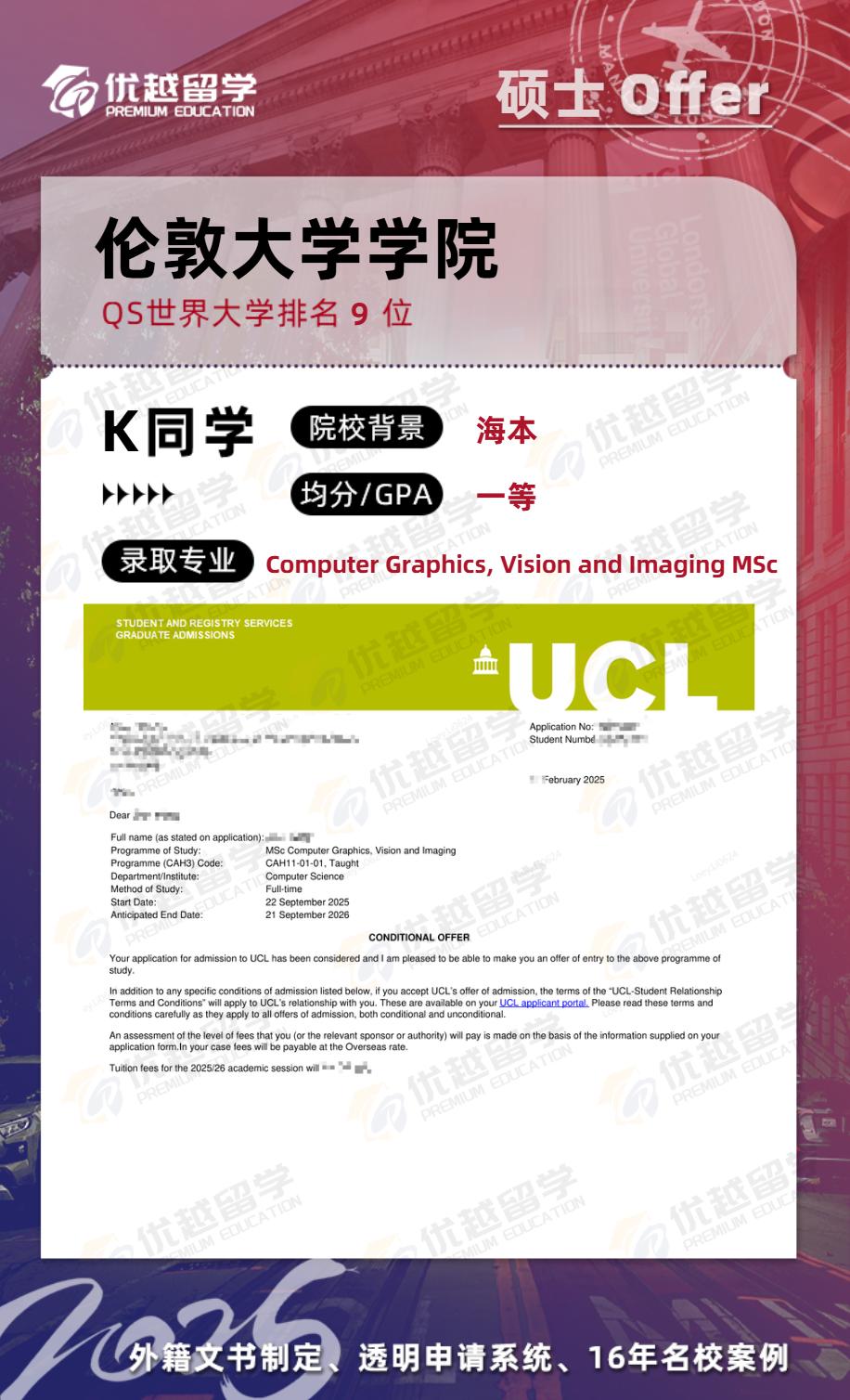 以上是【25fall英國(guó)碩士留學(xué)offer上新!【倫敦大學(xué)學(xué)院UCL】計(jì)算機(jī)圖形學(xué)專(zhuān)業(yè)】相關(guān)的全部?jī)?nèi)容,查看更多【offer榜單】、【名校案例】相關(guān)資訊可前往【優(yōu)越留學(xué)】首頁(yè)!世界名校申請(qǐng),找優(yōu)越留學(xué)!選校定校、申請(qǐng)規(guī)劃、文書(shū)寫(xiě)作、背景提升、方案定制一套搞定!點(diǎn)擊【在線咨詢(xún)】,優(yōu)越留學(xué)顧問(wèn)24h在線為您一對(duì)一解答!