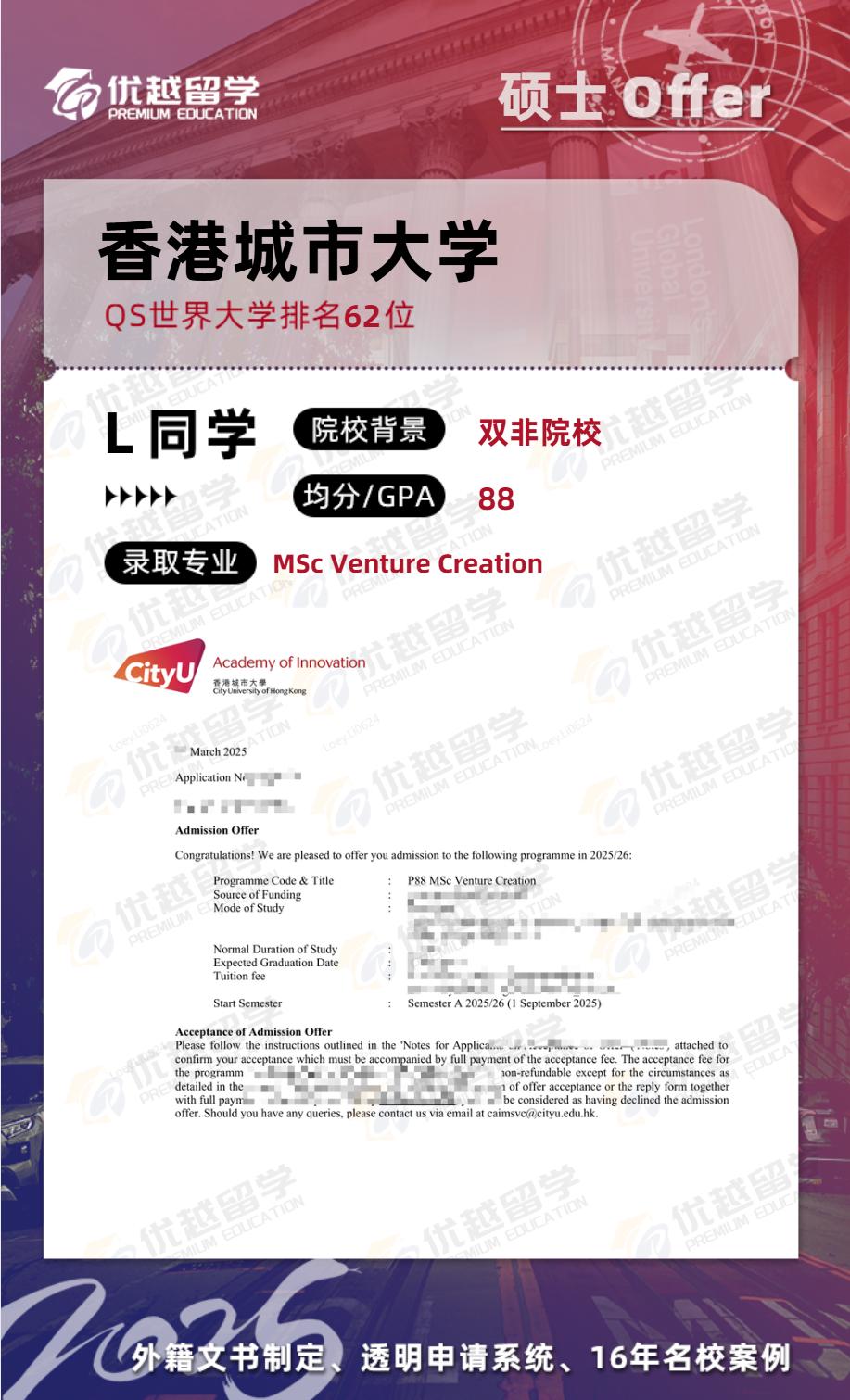 恭喜優越學員碩士研究生申請首戰告捷,拿下香港城市大學風險投資創新創業碩士offer。接下來,就跟優越君一起看看這位同學的上岸歷程~