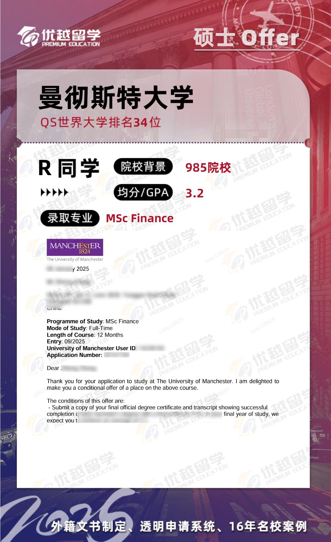 恭喜優越學員碩士研究生申請首戰告捷,順利拿下曼徹斯特大學金融學碩士offer。接下來,就跟優越君一起看看這位同學的上岸歷程~