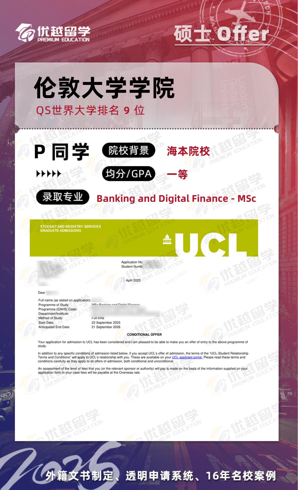 恭喜優(yōu)越學(xué)員碩士研究生申請(qǐng)首戰(zhàn)告捷,拿下UCL銀行與數(shù)字金融碩士offer。接下來(lái),就跟優(yōu)越君一起看看這位同學(xué)的上岸歷程~