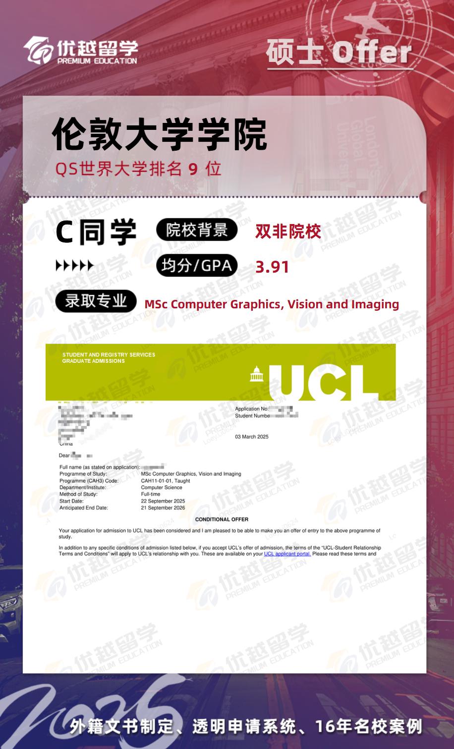 以上是【25fall英國留學(xué)機(jī)構(gòu)offer:【倫敦大學(xué)學(xué)院UCL】計(jì)算機(jī)圖形學(xué)、視覺和成像】相關(guān)的全部內(nèi)容,查看更多【offer榜單】、【名校案例】相關(guān)資訊可前往【優(yōu)越留學(xué)】首頁!世界名校申請,找優(yōu)越留學(xué)!選校定校、申請規(guī)劃、文書寫作、背景提升、方案定制一套搞定!點(diǎn)擊【在線咨詢】,優(yōu)越留學(xué)顧問24h在線為您一對一解答!
