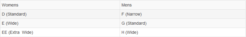 除了鞋的長度,寬度也是影響鞋子舒適度很主要的因素。還是拿Clarks的鞋子來說吧,他家就把寬度分紅以下幾個類型: