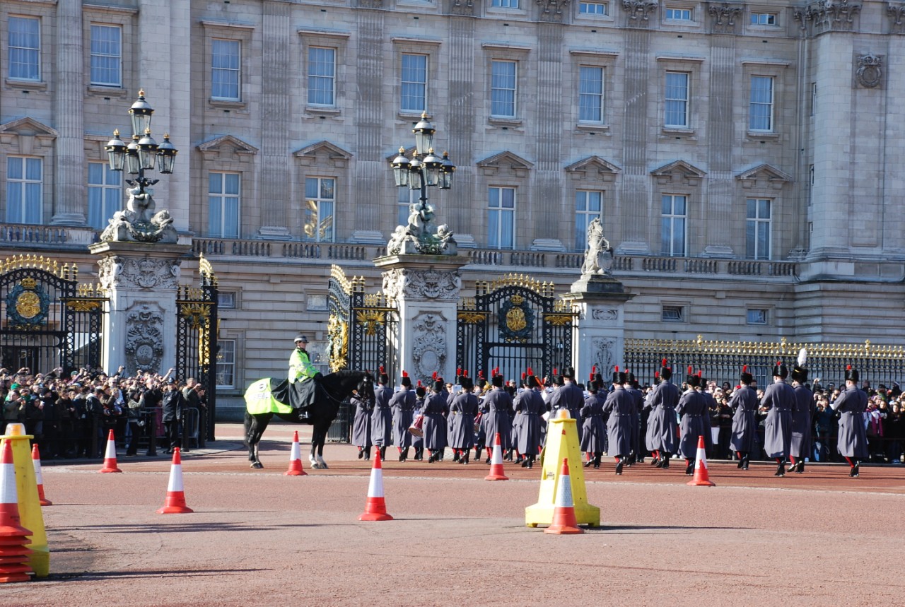 大部分來到白金漢宮的人都會由于各種不合適沒能進到宮內參觀。但是讓他們感到不虛此行的便是這個禁衛軍交接典禮。通常,在正常的天氣里,新衛兵會集合于圣詹 姆斯宮(St James’Palace) 和惠靈頓兵營(Wellington Barracks),11:00am時在樂隊的陪同下開始向白金漢宮前進,11:30會到達白金漢的前庭區域開始持續45分鐘左右的換崗交接儀式。