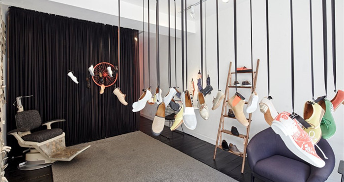 文具的元素隨處可見,比方信封的系帶被變換成了鞋帶,燒過的原木的形狀啟示規劃了一個系列高跟鞋的鞋跟。你能看到鞋子被掛在天花板上而不是規整擺放在櫥窗,懸掛的鞋子的天然晃動與腳的天然移動相契合。鞋子也因此被360°的展如今顧客面前。