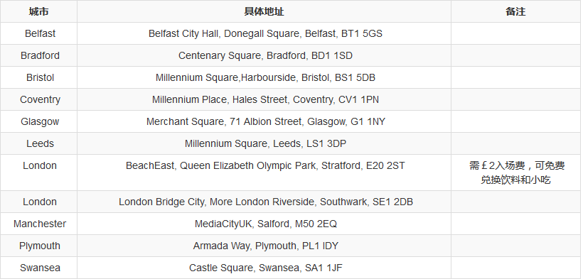 在全英范圍內,包括貝爾法斯特(Belfast)、布拉德福(Bradford)、布里斯托(Bristol)、考文垂(Coventry)、格拉斯哥(Glasgow)、利茲(Leeds)、倫敦(London)、曼徹斯特(Manchester)、普利茅斯(Plymouth)和斯旺西(Swansea)等城市都有英國國家隊的Official Team GB FanZones,在里約奧運期間,也就是8月6日~8月22日,在市中心區域,實時轉播奧運戰況。全部免費哦,現場還提供免費小禮品和趣味活動。
