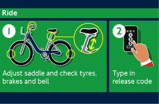 這時候我們就可以選擇自行車了,大家注意選車的時候要仔細查看車胎,車鈴,剎車把還有座椅是不是都是完好的。每輛自行車左邊會有一排數字按鈕,這里就輸入我們剛剛拿到的那5位密碼就好了,等到右邊的綠燈亮了就可以取車啦。拿到車以后大家可以根據自己的身高調整座椅,然后就可以騎著走啦。