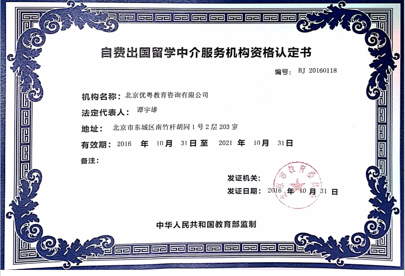 中國:中華人民共和國留學中介行業協會自費出國留學中介服務機構資格認定書編號:BJ20160118--北京優粵教育咨詢有限公司(優越教育國際北京下屬分公司),相關認證信息可登陸中華人民共和國留學中介行業協會教育涉外監管信息網//www.jsj.edu.cn查詢。