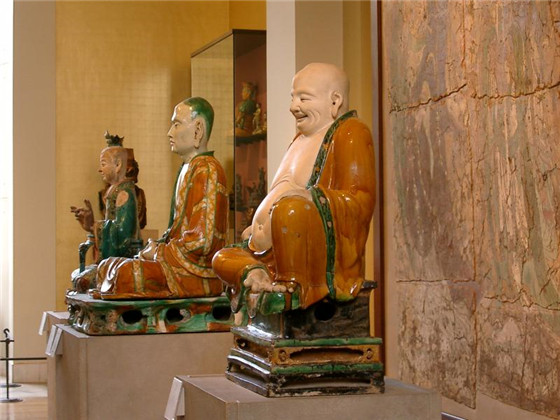 ??2. 中國廳中央墻上有幾十平方米的壁畫(33號展廳盡頭墻壁上),畫上的三尊菩薩裙帶飛揚,面容慈祥,形象端莊,體態豐滿,神貌各異。盡管年代久遠,依然可以看出當年的絢麗色彩。割痕把畫面分成了12塊。不少媒體稱其為敦煌壁畫,然而大英博物館的說明已經證實此壁畫來自于五臺山下的寺廟(河北省行唐縣的清涼寺),全壁畫由幾萬片大小不一的碎片精細粘合而成。據稱,1926年秋冬,英國人與當時的縣政府勾結,買走了三菩薩壁畫。后在日寇侵華期間幾經戰亂,清涼寺被夷為平地,余下的所有壁畫在文革中被全部損毀。