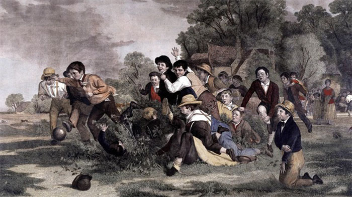 事實上,現代足球的發源地就在英國。追根溯源,足球運動出現在羅馬時期,后來傳入高盧地區,由征服者威廉帶到了英國。那時候的足球運動可以用兩個詞來形容——盛大和野蠻,踢足球是一場跨城的全民運動。兩個城鎮,上千人,不顧一切要把球踢到對方的市中心去。球所到之處,無論廣場、農田、商店還是住宅,都逃不過被破壞的命運,造成的效果堪稱狂風過境。但是那時候的英國人對此毫不在乎,只要能把球踢到對方的老窩,受傷流血在所不惜,跟狂熱的恐怖分子一樣。