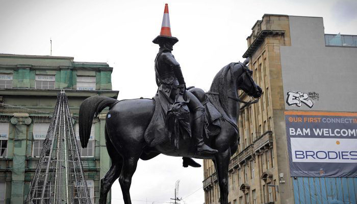 但是為什么小編要說(shuō)無(wú)力吐槽呢?這個(gè)事情你聽(tīng)了之后,你也會(huì)無(wú)力吐槽的。你就說(shuō)這樣好端端的一個(gè)雕像,這樣霸氣莊嚴(yán)的人物,能不能讓人家安靜的在格拉斯哥現(xiàn)代美術(shù)館門(mén)前做一個(gè)“花瓶”呢?格拉斯哥人民的回答是不能!他們偏偏要把英式幽默發(fā)揮到能夠彰顯其風(fēng)采的每一個(gè)地方,所以這個(gè)雕像從此就有了帽子,一頂并不常規(guī)的帽子——交通警示錐。無(wú)奈的當(dāng)局也不知道是哪位富有藝術(shù)造詣的市民搗鼓的,所以就只能拆啊,可是拆了又來(lái)拆了又來(lái),加上格拉斯哥人民也很喜歡這個(gè)不一樣的威靈頓公爵,到后來(lái)當(dāng)局也就“放棄斗爭(zhēng)”了。