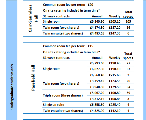 學校宿舍:倫敦和倫敦以外還是有一定差距的,可以感受一下LSE(倫敦)和卡迪夫(倫敦外)的住宿收費情況:(下圖為部分宿舍區收費情況)