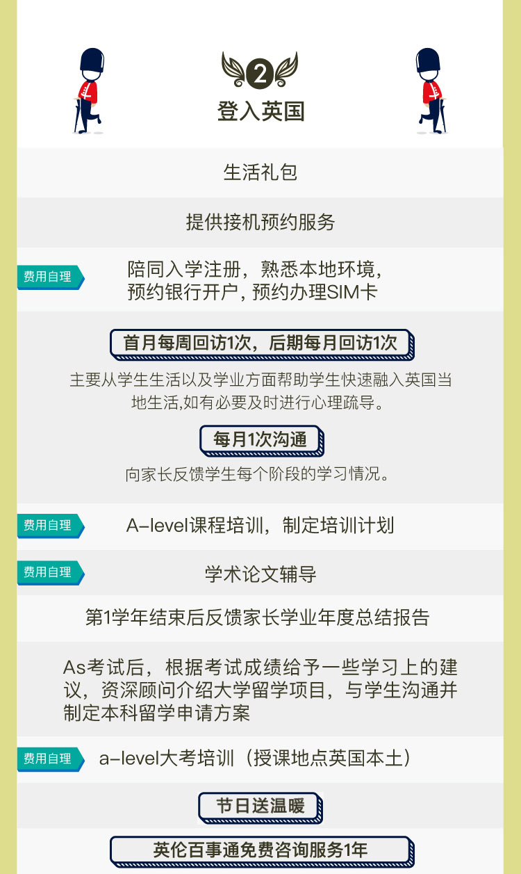 完善的一體化流程,提供1對1式溝通學習規劃及留學方案,給予學生專業意見,選擇最適合的學校及專業。1對多行前輔導,使學生們快速了解并融入英國當地生活。入學后,針對學生的生活及學業方面進行關懷與回訪。首月每周進行一次回訪,后期將每月回訪一次為了讓遠在國內的家長們及時了解孩子的動態,每月與家長進行一次溝通,具體了解學生每個階段的學業情況,讓家長安心。節日及時送出溫暖服務進行關懷,并提供英倫百事通咨詢服務一整年,讓您無需顧慮學業外的任何生活瑣事。