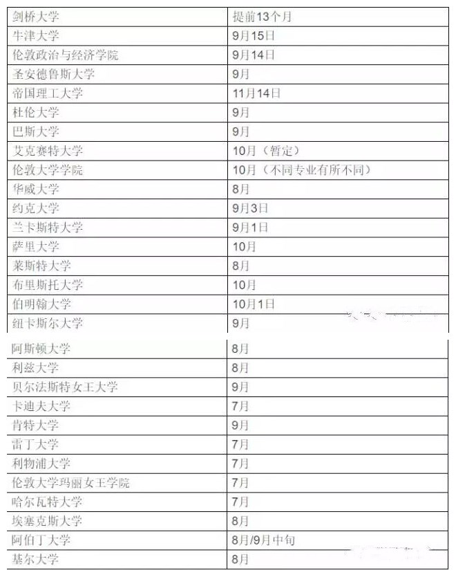 一般來說,每年的9-10月份,英國大學都會陸續開放申請通道,不同學校時間也會有所不同,12月基本接近尾聲。在此優越教育特別提醒同學們:根據多年的留學申請經驗,英國大學申請,向來趕早不趕晚,并且招生名額都是有限的,所以同學們一定要及時申請哦,一旦過了截止日期,就算你再優秀,也是白搭~