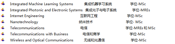 Communication在文學領域中譯作傳媒,傳播學,但是在理工科中也有譯作通信。在碩士專業中很少有直接開設通信工程的,基本上是在電子工程碩士的分支下可以找到。如下圖:UCL-倫敦大學學院。
