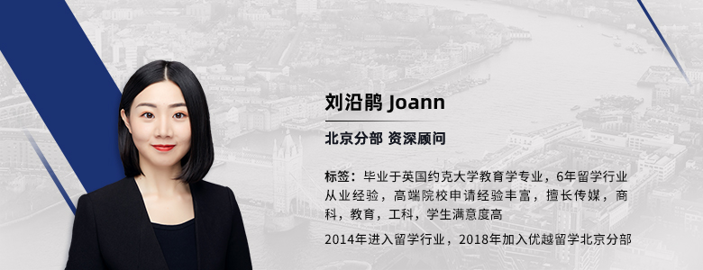 優越教育北京分部,成立于2016年,坐落北京市東城區銀河SOHO大廈,北京分部顧問團隊有著豐富的留學申請行業經驗,行業經驗8年以上的顧問比例過半。團隊成員多元化的海外留學&就業背景是其特色,各人畢業于英國、瑞士、亞洲知名大學,主修商科、教育學、語言學等專業。團隊成員具備豐富的英國、澳洲、香港、新加坡、加拿大等國家中學、本科、碩士、博士申請成功經驗。 以下是北京分公司團隊成員介紹(排名按英文首字母順序)。