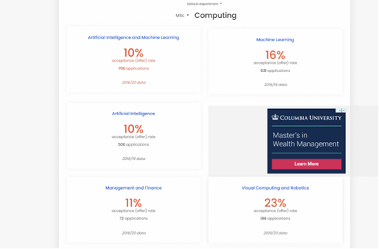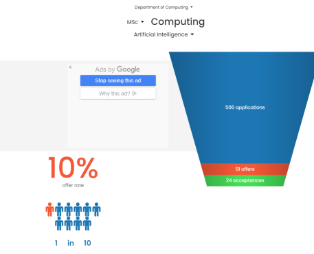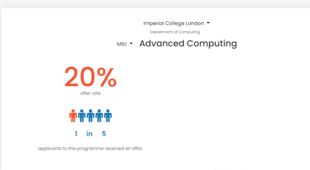 但為了滿足同學想要學習人工智能方面的訴求。在專業選擇上,通過我們的比較仔細研究,我們選擇MSc Advanced Computing作為同學的第二志愿。因為通過對比發現這兩個專業的課程設置十分相似。但競爭稍微少一些。根據官方數據,前者是10個人里有一個offer,后者則是5個人里有一個。