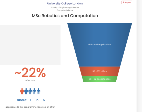 所以,我們提到的第四個辦法就是選擇成功率更高的院校,如果十分想要申請G5院校,不如試試UCL。如果你也是計算機科學或者數學相關專業,對機器人感興趣,可以嘗試申請UCL Robotics and Computation MSc這個專業。今年這個專業的錄取比例在22%。