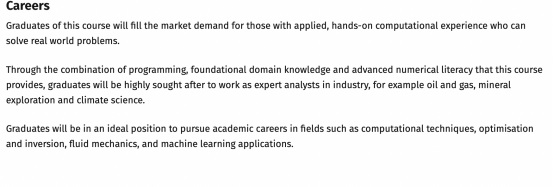 如果你覺得以上兩個專業的申請成功率還不夠高,但還是想往計算機科學方向發展。那你可以看看地球科學與工程學院的MSc Applied Computational Science and Engineering這個專業。這個專業的今年錄取率在36%。它的申請條件是,二等一學位,國內均分85。雅思6.5,小分6.0。不過這個專業的未來職業規劃會與前兩個專業有些不同。所以從申請動機,到軟背景匹配,再到職業規劃都需要做調整。而這個專業的畢業生將在計算技術、優化、流體力學和機器學習應用等領域從事學術工作的理想位置。