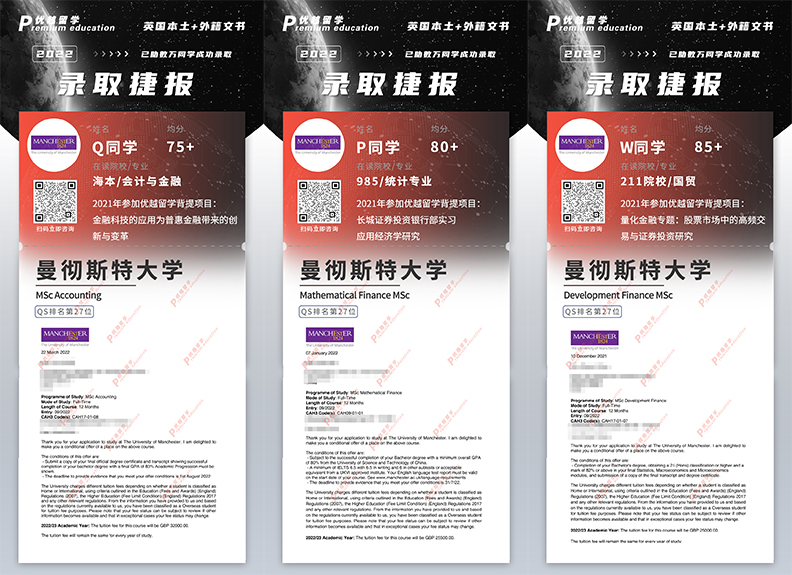 曼大的List特別復雜,甚至同一學院的不同項目List也會有所不同,而今年曼大調整List之后勢必會收緊原有的認可名單以及提高原有的均分要求。如果同學們想要申請曼大的金融相關專業,優越建議均分要提高到85分,雅思7.0,申請時要提交GMAT/GRE成績。更重要的是,一定要準備1~2段金融相關的高質量實習或科研。