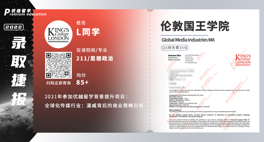 ? 【轉(zhuǎn)專業(yè)申請】放棄英??缟陚髅?,拿下全英第三的KCL傳媒offer!