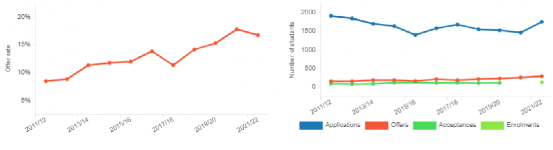 然而及時錄取率如此之低的情況下,LSE歷年來的申請人數仍在逐年增加。近五年LSE碩士申請的人數已經從2016年27737人上升至2021年40108人。然而offer發放率卻從2016年的30.4%下降到2021年的22.7%。