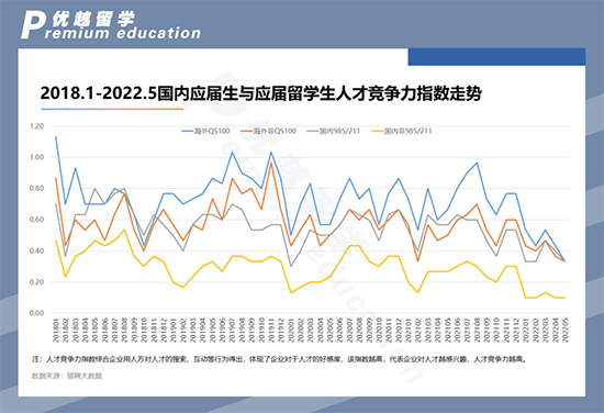根據(jù)獵聘大數(shù)據(jù)研究院發(fā)布的《2022 海外應(yīng)屆留學(xué)生就業(yè)競爭力洞察報告》數(shù)據(jù)顯示:普遍來說應(yīng)屆留學(xué)生的人才競爭力比國內(nèi)應(yīng)屆生更高,呈現(xiàn)出海外QS100 > 海外非QS100≈國內(nèi) 985/211 > 國內(nèi)非 985/211的走勢。