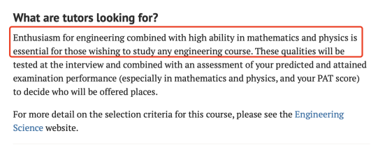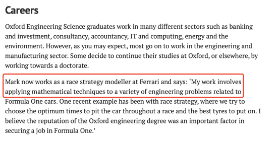 牛津在專業(yè)的官網(wǎng)上明確指出了,他們希望錄取對(duì)工程專業(yè)有著極大熱情并且自身數(shù)理能力是非常優(yōu)秀的學(xué)生,以及在牛津前兩年的課程設(shè)置中數(shù)學(xué)相關(guān)的科目占到了很大的比例,其次在這個(gè)專業(yè)的職業(yè)部分,講述的是他目前的工作,就是把數(shù)學(xué)技能運(yùn)用與解決各式各樣的工程問(wèn)題,我們也可以看到一位來(lái)自牛津工程專業(yè)畢業(yè)生的自述。