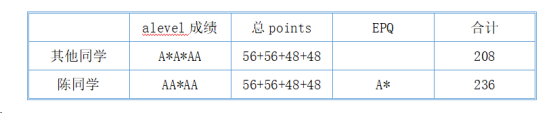 1. EPQ可以提供非常可觀的UCAS points加分,我們看到陳同學(xué)和其他同學(xué)的UCAS points對(duì)比。在成績(jī)科目大致相同的情況下,取得EPQ A*的陳同學(xué),他的UCAS points就比其他同學(xué)多上28分。