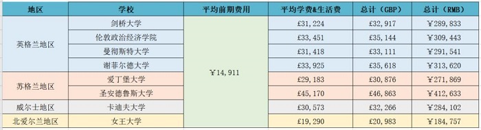 5、英國各地區留學費用匯總