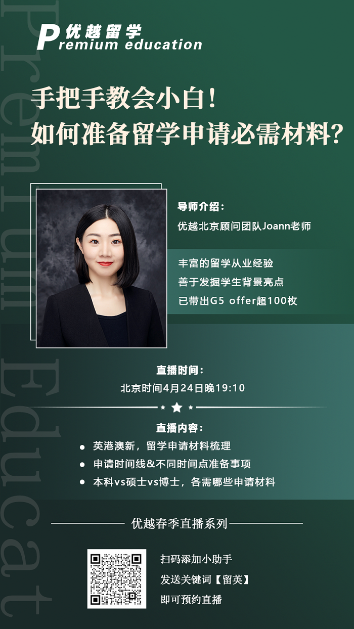 很多學校比如新國立,提前批的申請材料比常規申請的材料更少。準備申請材料是個復雜瑣碎但至關重要的步驟,為了厘清這項大工程,優越君特意邀請了專業資深顧問為大家詳解。