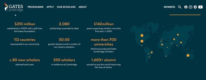 自2001年首次頒發以來,劍橋大學蓋茨獎學金已經向來自112個國家、畢業于全球700多所大學的2100名學者頒發了獎學金,涵蓋了劍橋大學的80多個學術部門和所有31個學院。