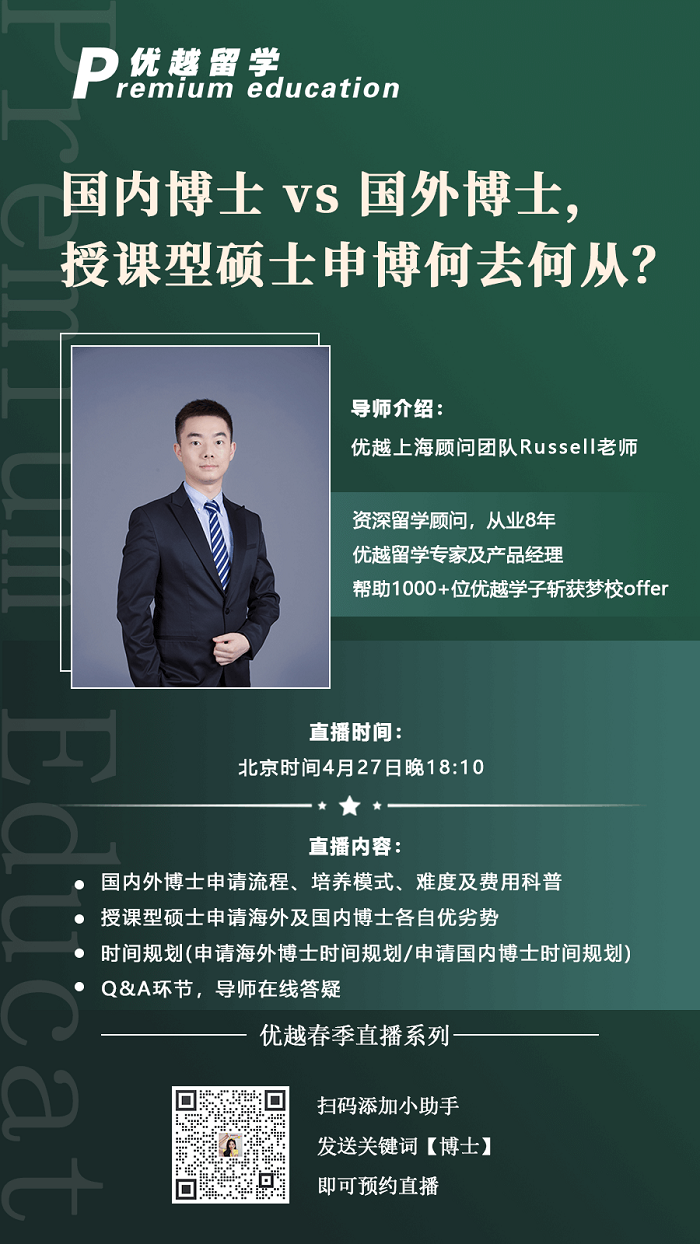 看到這里可能很多同學又有疑惑了:申請博士到底如何DIY?4月27日(周四)晚18:10,優越春季直播系列線上講座,博士專場之「國內博士 vs 國外博士,授課型碩士申博何去何從?」,直播中將在線解答關于海碩申博申請的疑問~
