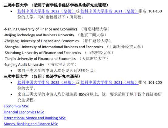 并且格拉斯哥大學(xué)將中國院校分為了7個不同的檔次(A1、A2、B1、B2、C、D、TNE),各有分?jǐn)?shù)要求。具體如下圖所示: