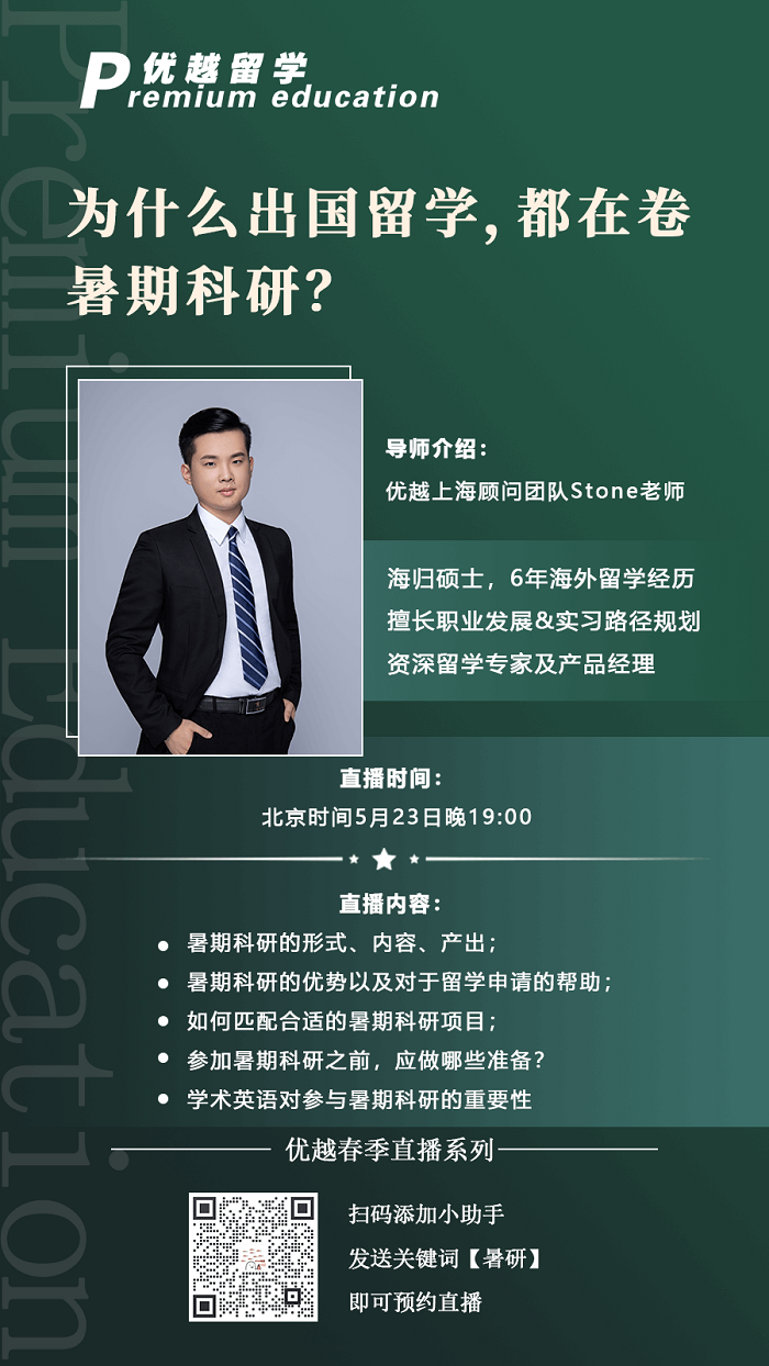5月23日,優(yōu)越留學(xué)申請(qǐng)線上講座春季篇之【為什么出國(guó)留學(xué),都在卷暑期科研?】預(yù)熱報(bào)名中。