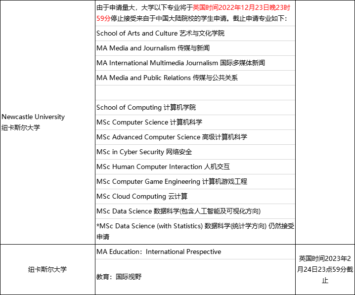 23fall的申請(qǐng)中,紐卡斯?fàn)柎髮W(xué)的部分傳媒類專業(yè),計(jì)算機(jī)專業(yè)在2022年12月就停止申請(qǐng)了。而國(guó)際視野這個(gè)專業(yè)則到23年的2月份預(yù)計(jì)關(guān)閉。