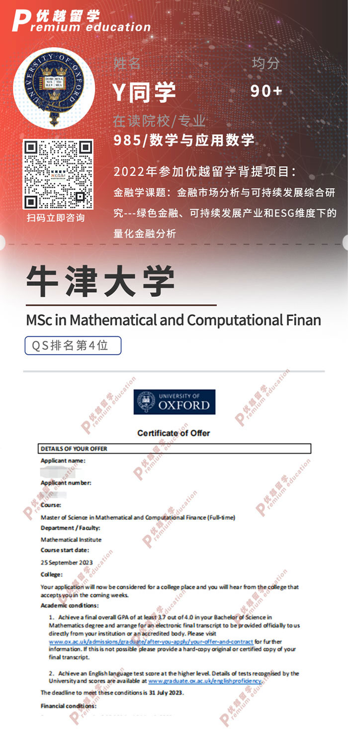 通過優越留學背提項目的學習和研究,Y同學成功獲得了牛津大學的offer。
