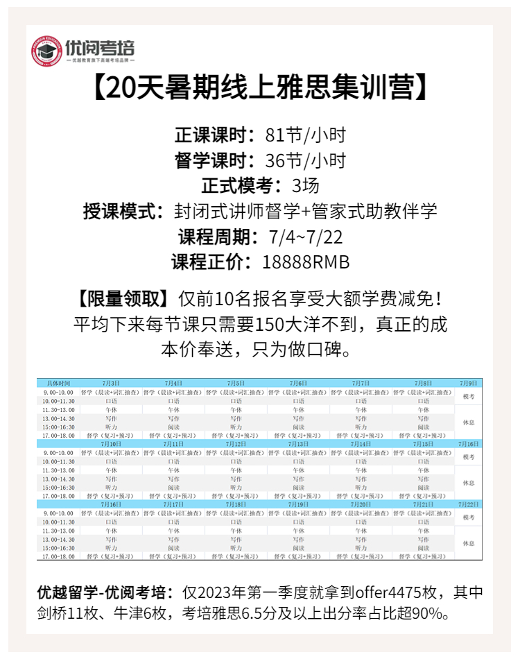 優(yōu)越教育提供一站式雅思考培和留學(xué)申請(qǐng)服務(wù)。我們覆蓋閱讀、寫作、口語(yǔ)和聽(tīng)力的各個(gè)方面,包括題型技巧、高頻詞匯訓(xùn)練和真題練習(xí)。我們致力于幫助學(xué)生在雅思考試中取得優(yōu)異成績(jī),并順利申請(qǐng)到理想的院校。通過(guò)我們的服務(wù),學(xué)生可以獲得專業(yè)指導(dǎo)和個(gè)性化輔導(dǎo),實(shí)現(xiàn)留學(xué)夢(mèng)想。