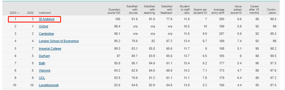 圣安德魯斯大學在2019年全國學生調(diào)查(NSS)中的學生學術(shù)經(jīng)驗方面和滿意度排名第一。根據(jù)Guardian University Guide 2023顯示,St Andrews躍升英國第一位,高于劍橋大學,牛津大學。