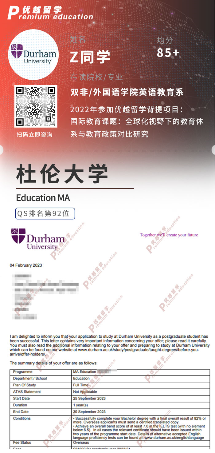 在申請過程中,同學通過努力和自我提升成功地獲得了杜倫大學的錄取。被錄取到Education MA專業。