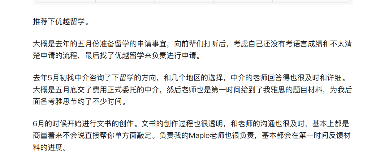 文書安排了有相關寫作經驗的文案老師,尤其是針對G5院校的個人陳述寫作非常老道。他們給我看了幾篇文書范文,感覺質量很高,而且是真的從申請的學生個人情況來考慮。而且優越的外籍文書很吸引我,雖然我本人是英語專業,但寫PS這種類型文章終究沒有經驗,摸不透英國大學的喜好。所以我覺得申請G5有外籍老師幫忙改文書會比較安心。