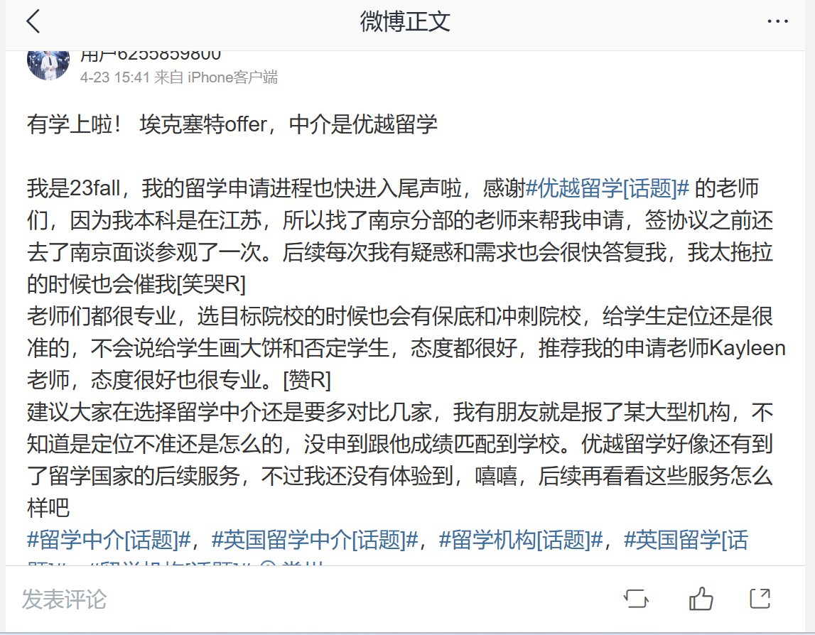 優越留學在學生和家長之間的聲譽一直以來都是非常優秀的,無論是在口碑傳播還是在各大社交平臺上,都能找到大量正面的評價和推薦。這種卓越的口碑并非偶然,而是源于優越留學在留學服務領域的專業性、高效性、嚴謹性以及對客戶需求的高度關注和及時回應。優越留學對客戶需求的高度關注和及時回應也是其口碑優異的重要保障。他們始終將客戶的利益放在首位,傾聽學生和家長的意見和建議,并根據實際情況進行調整和改進。無論是在留學過程中遇到的問題還是對服務的需求,優越留學都能夠及時回應和解決,給予學生和家長充分的支持和幫助。