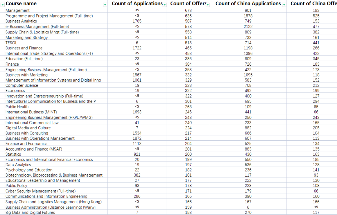 在中國學生的申請中,華威商學院、WMG學院、教育學系、應用語言學系、文化及傳媒政策、經濟學系以及計算機系等院系受到了較多的申請。