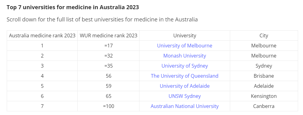 根據2023年TIMES大學排名,澳洲八大全部入圍醫療領域世界大學前100之列(見下圖)