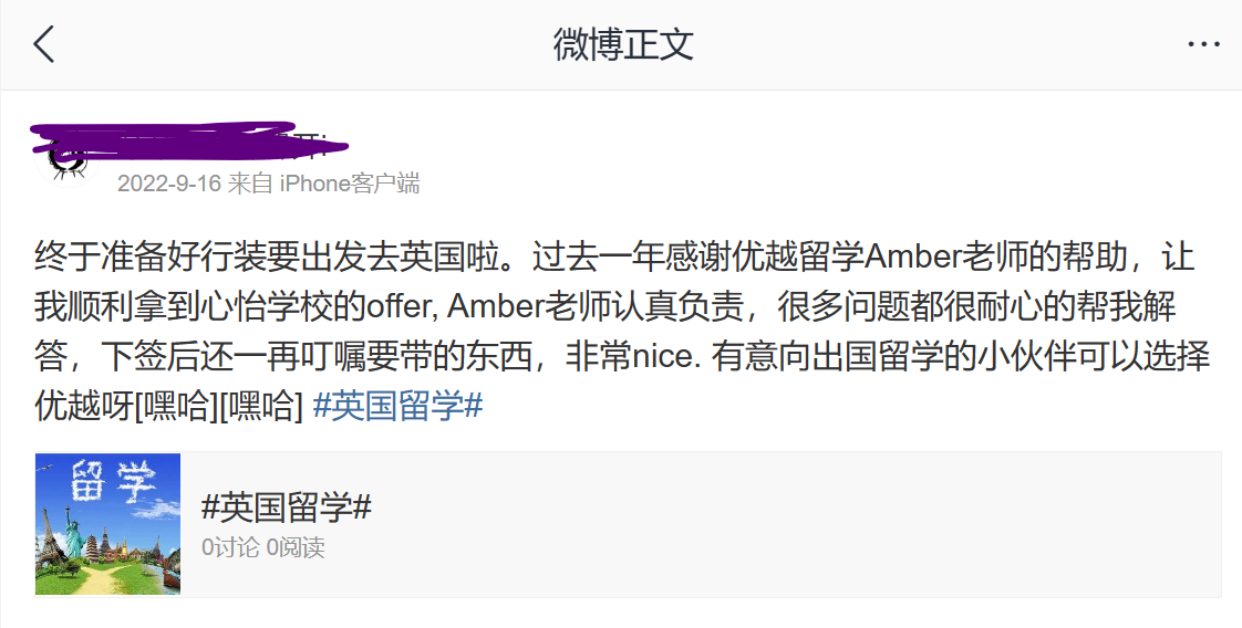 B同學:優越留學里的顧問老師從頭到尾都很負責,會及時回復我的問題,回答的也很專業值得信賴,還會在每個時間節點提醒我提交、申請材料,整個留學申請過程都很順利,文書老師我也挺滿意的,寫的很好。