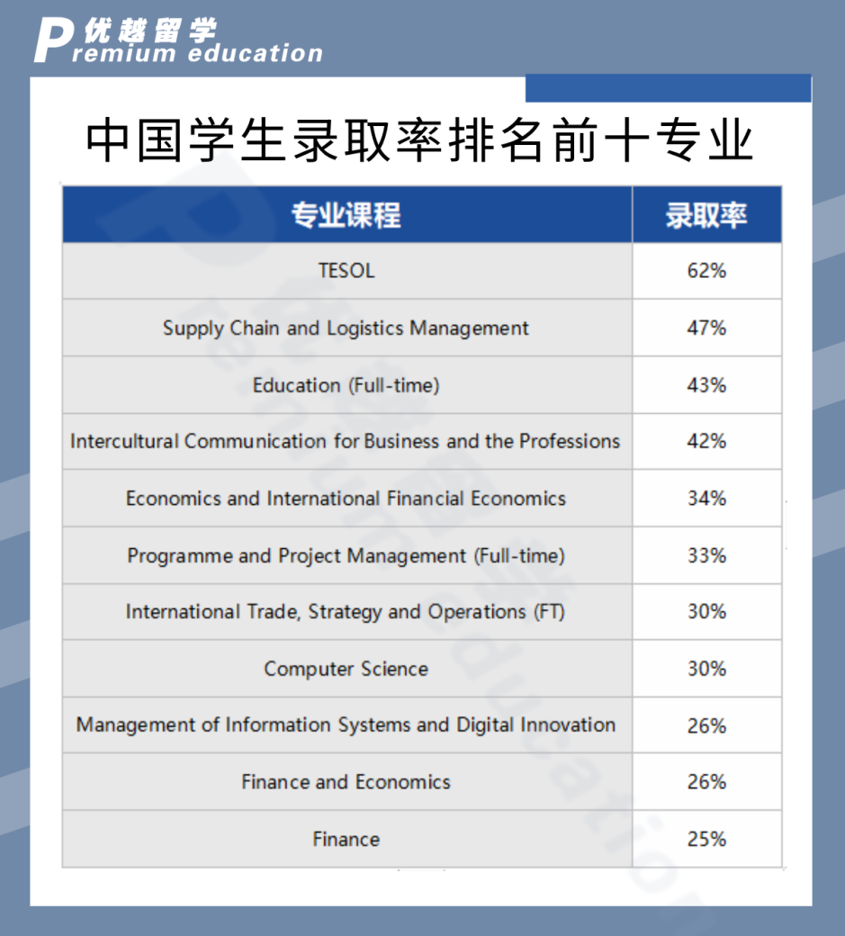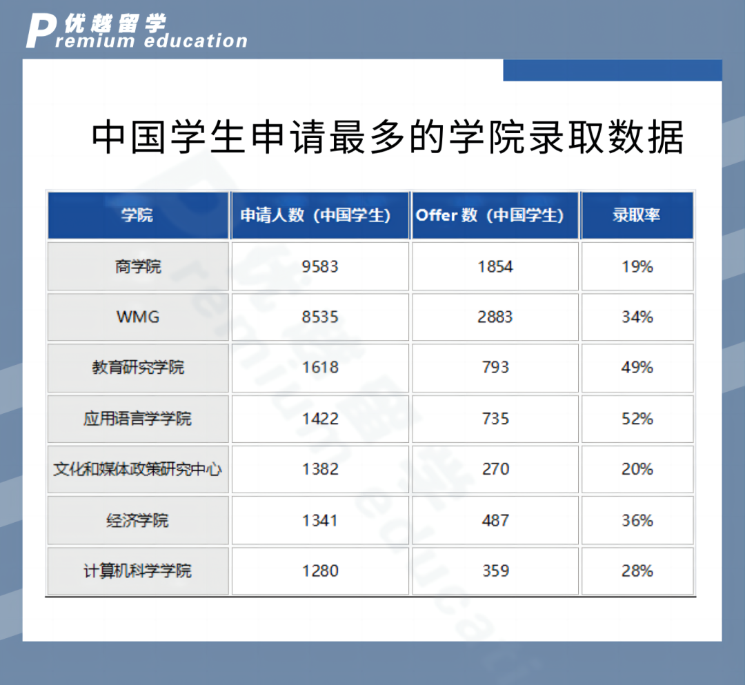 從錄取率來看,應(yīng)用語言學(xué)院中國(guó)學(xué)生錄取率最高,高達(dá)52%。其次是教育研究學(xué)院,錄取率49%。WMG和經(jīng)濟(jì)學(xué)院錄取率不相上下,也是對(duì)中國(guó)學(xué)生比較友好的學(xué)院。